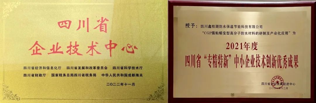其中我司自主研發、生產的差異化產品CGP強粘高分子防水卷材系列,該項經科學技術成果評價,成果水平達到國內領先、同時也獲得四川省“專精特新”中小企業技術創新優秀成果證書。新一代科技防水材料產品,具有“強力粘結和蠕變密封”兩大特點,冷施工,耐老化性能優,適用范圍廣,全生命周期低碳環保。