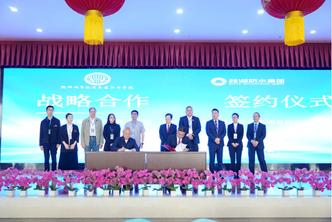 在大家共同見證下,現(xiàn)場簽訂了校企戰(zhàn)略合作協(xié)議,德陽城市軌道交通職業(yè)學(xué)校理事長袁愛林、桂湖集團(tuán)董事長孫軍忠作為雙方代表進(jìn)行簽約。雙方將基于防水材料市場需求或發(fā)展方向,共同聯(lián)合攻關(guān)。
